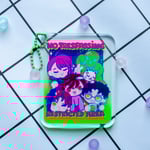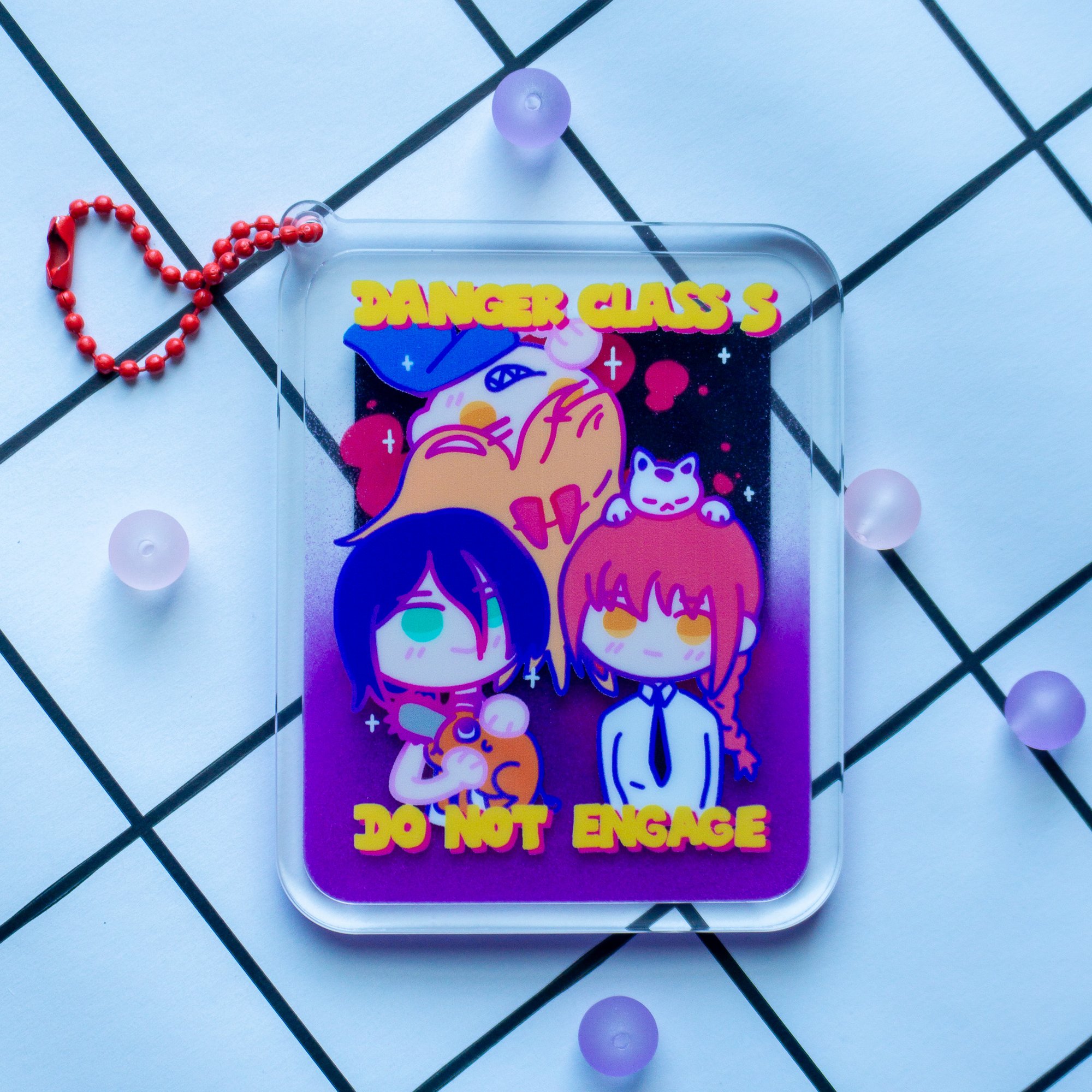 Layered liquid Dandadan and Chainsaw Man keychains.